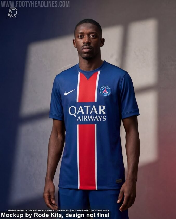 Le maillot domicile du PSG version 2026-2027 prend forme au fil des indiscrétions venues de plusieurs sources spécialisées. D’après les éléments publiés par La Source Parisienne et Footy Headlines, appuyés par un mockup du designer Rode Kits, Nike s’orienterait vers un retour aux codes forts de l’identité parisienne.